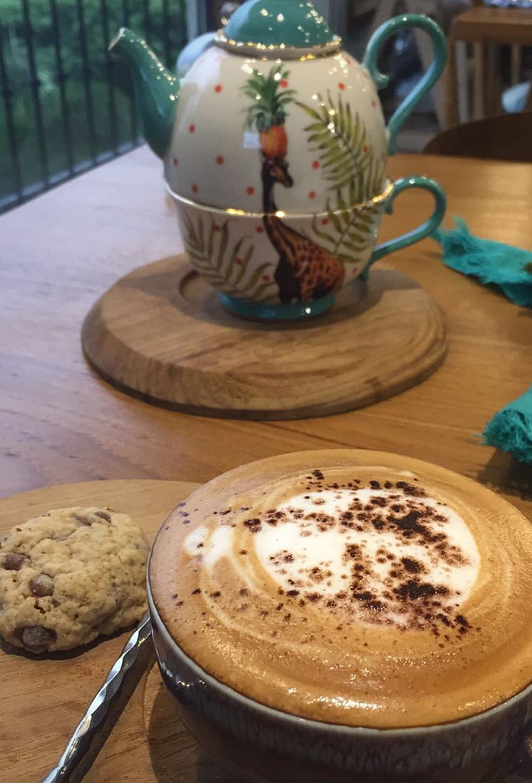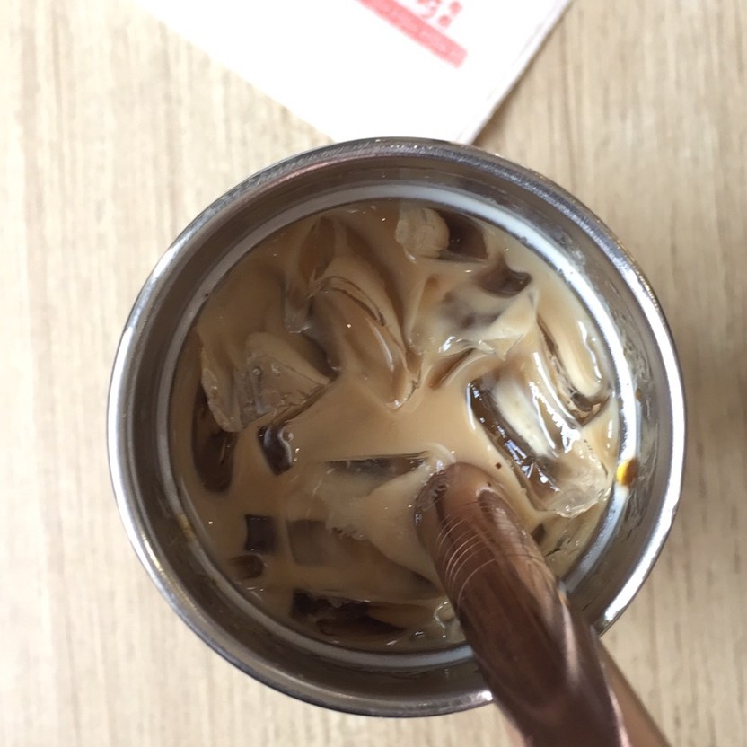 Milk tea with pearls. White tee and denim jeans. Coffee with sweets.